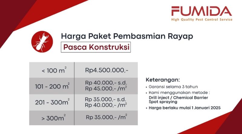 Selain metode yang modern dan survei lokasi gratis, harga layanan basmi rayap juga sangat terjangkau, yakni berada di kisaran Rp35.000 hingga Rp85.000 per meter persegi. Harga tersebut tergantung dari jenis yang dipilih, apakah itu pra konstruksi, pasca konstruksi, atau pipanisasi.